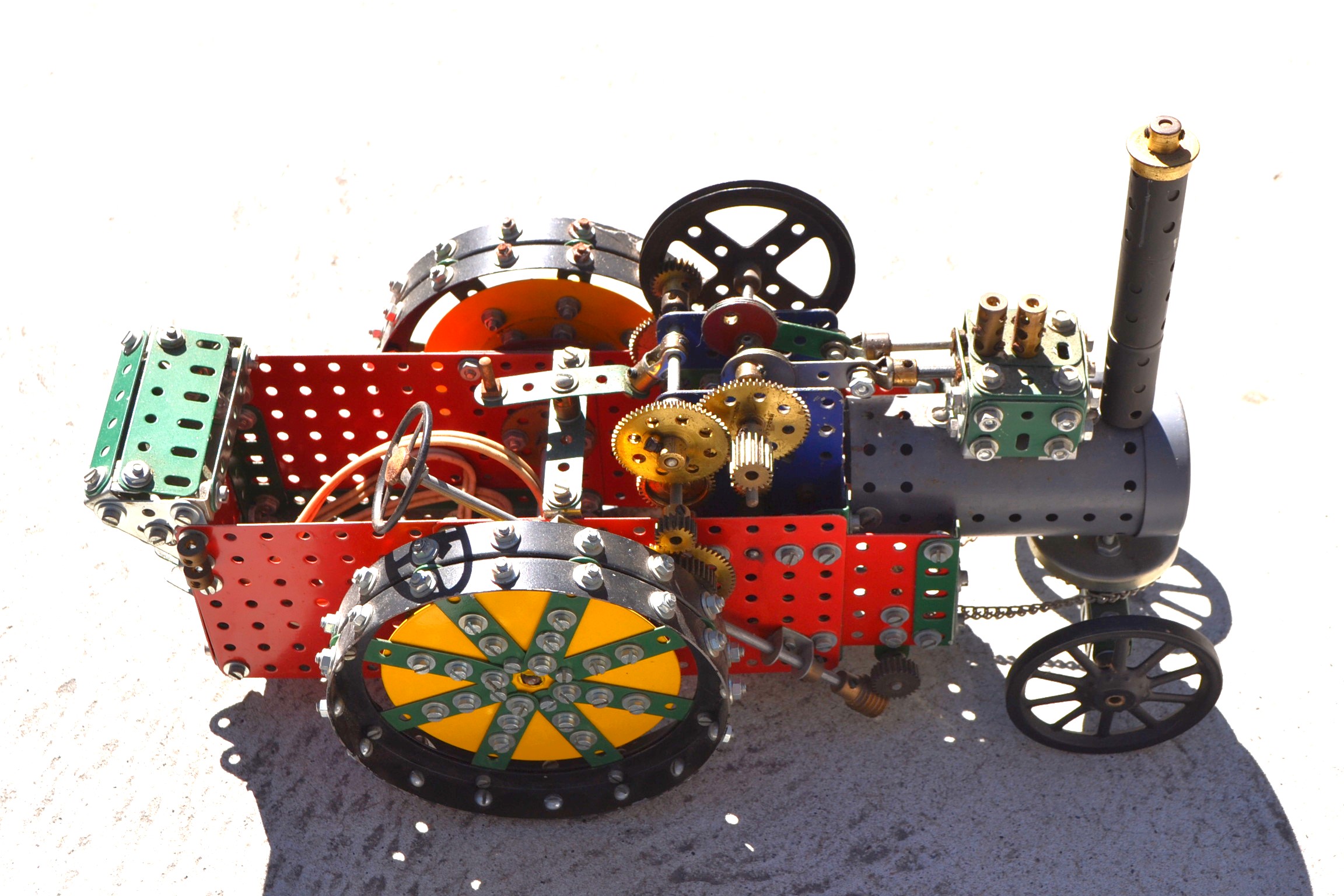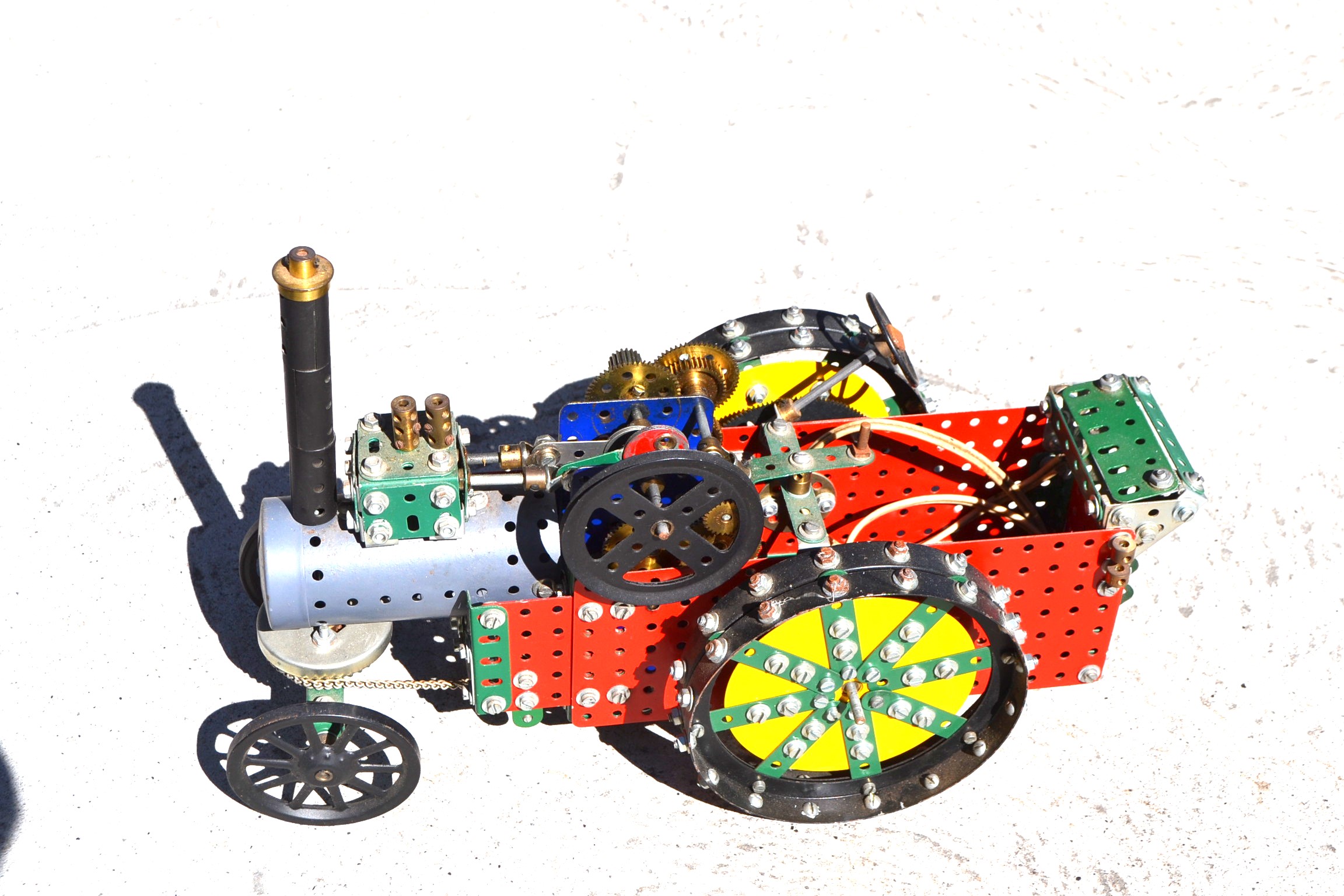 Lindsay Farrell is selling his late father’s Meccano Traction Engine. It is based on a Meccano Supermodel and its approximate size is 500mm long by 250mm wide. An E15R electric motor with built-in reversing switch is included.plus the relevant Supermodel leaflet. See photos.