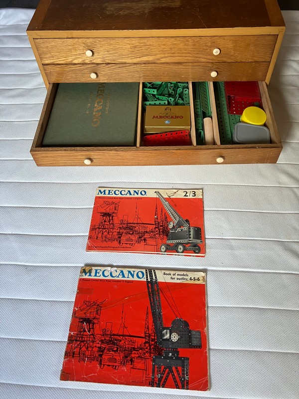 Patrick Barrie is selling his late father’s No 10 Meccano set including its 4 drawer cabinet in one lot. The red and  green set and manuals are dated in the late 1950s (see photos).