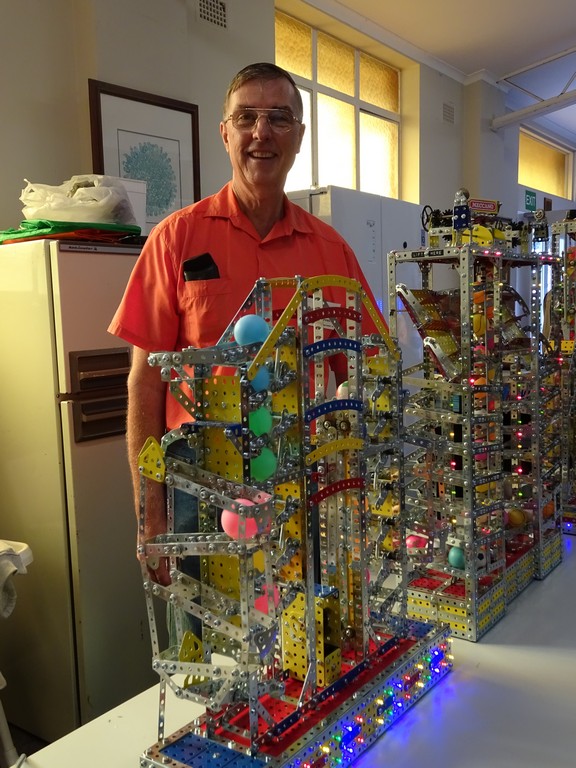 Annual Exhibition 2018 Models Doug Trounce with his Collection of Ball Rollers Image 28 of 50 Photo: Chris Johnson Any corrections to captions, changes of attribution or requests to delete should be sent to webmaster@sydneymeccanomodellers.org.au